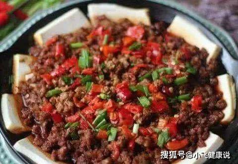 2.豆腐切片,碼在盤中,開水上鍋蒸2分鍾;熱油中下入肉末炒散;再下姜蒜末、剁椒和郫縣豆瓣煸炒;