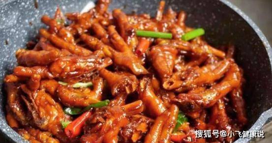 4、將炸好的雞爪,加雞湯、薑片、干紅椒、大蒜籽,再放入精鹽、醬油、味精用中火煨燜,至雞爪脫骨,收汁裝盤即成。