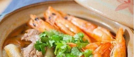 8.20分鍾時取出蔥段,40分鍾時加入白蘿卜與鹽, 55分鍾時加入大蝦