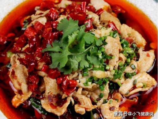10.將煮好的肉片倒入容器里,將剁碎的花椒、辣椒碎、辣椒粉、花椒粉、蒜末撒在肉片上