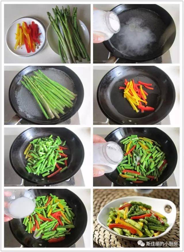 今天推薦這個素炒快手菜的彩椒炒蘆筍,一直就覺得蘆筍和彩椒是很小資的蔬菜,色彩艷麗, 食材雖然很簡單,但營養豐富,味道也毫不遜色, 是夏日裡你值得擁有的清新爽口。但要注意,挑選蘆筍以形狀正直、筍尖花苞緊密、沒有水傷腐臭味,表皮鮮亮不萎縮,細嫩粗大,基部未老化,以手摺之,即斷者為佳。如果蘆筍有點老的話,要把底部的表皮削掉一些,建議大家可多多食用蘆筍哦。。