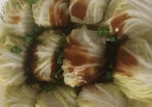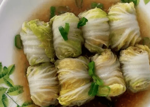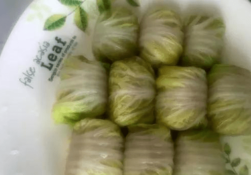 2.娃娃菜焯水後,把菜幫厚點的部分用刀片薄,然後卷好肉泥,裝盤。