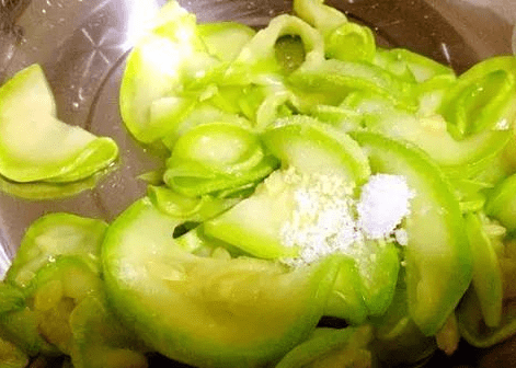 2.放入鹽,戴一次性手套把鹽均勻的塗抹在西葫蘆片上醃20分鍾左右