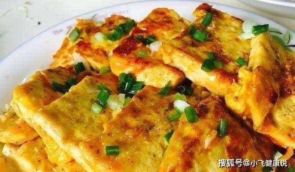 2、鍋內入油燒熱,小火將豆腐煎成兩片金黃色撈出待用