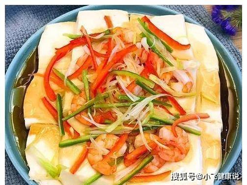 4、豆腐均勻的撒入適量鹽,放上蝦仁,放入燒開水的蒸鍋中蒸10分鍾左右,出鍋後把多餘水倒掉。