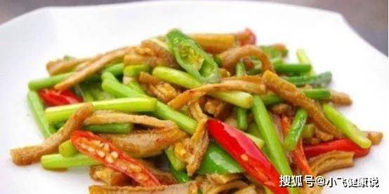 3.鍋中倒入食用用燒至5成熱的時候,把姜和大蒜放進去爆香,倒入壓好的肚絲翻炒,大火翻炒片刻,放入青辣椒紅辣椒同炒。