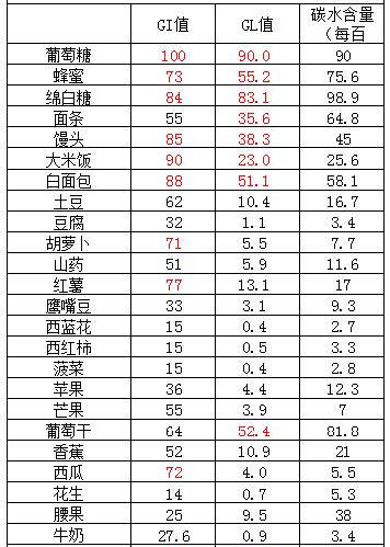 我們只要知道GI值,就可以通過查食物成分表里的碳水化合物含量來計算GL值。GL值低於10的一般就可以放心吃了。