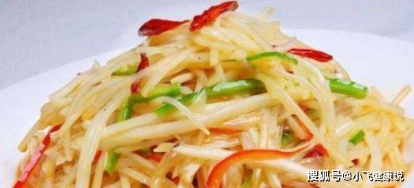 7、倒入瀝過水分的土豆絲,炒至八成熟時加入精鹽、味精調味,再淋上香油和白醋,炒熟即可