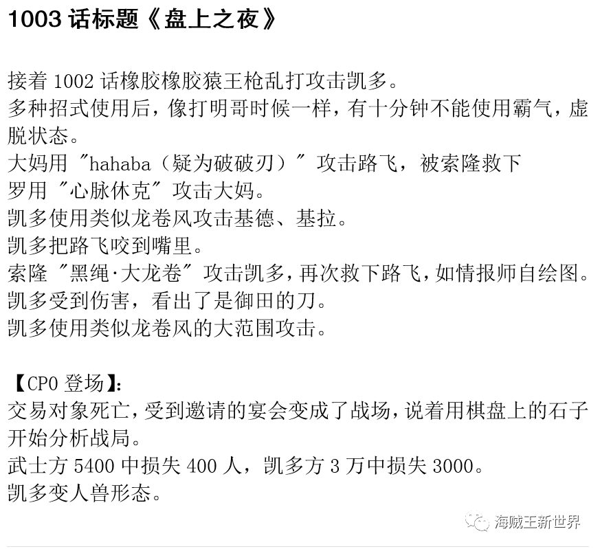 動漫 海賊王1003話第一次情報更新|索隆砍傷凱多|凱多人獸形態開始認真?|CP0登場 2021 年 8 月 26 日 情報均來自海外論壇 僅供海米討論分析使用 如侵請聯系我們處理 (情報師手繪圖) 下周不休刊! 凱多終於開啟人獸形態 估計開始認真了,龍形態輸出不行 路飛霸氣使用過度畢竟一開始就四擋 如果後面沒有新的招式和形態的話可不好打。 本話索隆依舊帥氣!! CP0會不會介入戰局? 還是說想坐收漁人之利? 作筆記是好習慣,給你新想法 相關文章: 海賊王990話 第二次情報更新|德雷克跟路飛合作!或許他才是最大贏家 海賊王993話 第二次情報更新|逃不過的斷臂命運,凱多開始發威! 日本網友吐槽:連廁所都在跟《EVA》聯動? 原來美少女是蹲著開機甲的?這部新番的JK可真香啊 朱一旦又去參加脫口秀了,這是要轉型的節奏? 「人類高質量男性」開直播,建議朋友們看個樂子,太認真就不用了 中國的動漫愛好者們可以不喜歡哆啦A夢,但就憑這一集就沒得黑 9月3日強勢來襲!《網球王子》全新3DCG動畫電影公布最新宣傳片 書店「外國兒童文學」區出現春物輕小說,網友吐槽:從小學會胃痛 特利迦:伊格尼斯是黑暗特利迦身份石錘,他的變身器從何而來