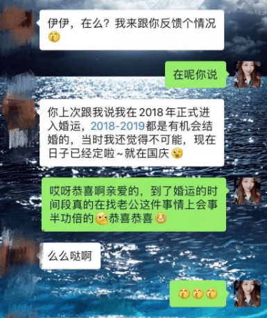 陳安逸看了星盤,算到2018年會結婚,結果不久小美真的遇到了心動男生,雙方朋友和家長都覺得非常滿意,進展出奇順利,當年國慶節隆重舉行了婚禮。