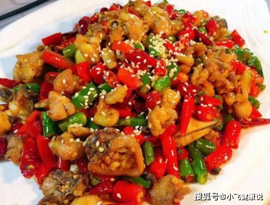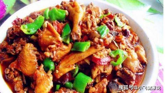 7.加入辣椒;翻炒均勻,這時濃烈如餐館的香味會不斷飄出;加入炸過的雞塊,繼續翻炒;加入極少的糖和鹽;