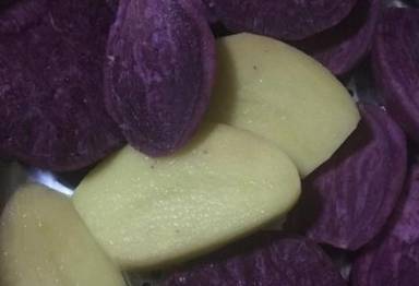 我們准備適量的紫薯和土豆清洗干淨之後切成塊放進蒸鍋當中,然後蒸鍋里邊加入適量的清水,這樣大火燒開之後轉成中火蒸15分鍾左右。