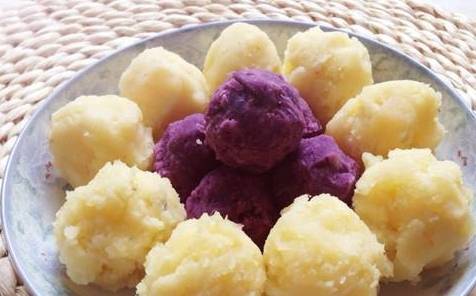 這時候土豆和紫薯蒸好之後,我們可以將土豆剝去皮之後壓成土豆泥,然後放入適量的胡椒粉和香油,這樣攪拌一下。