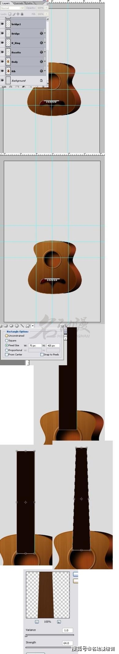 步驟十一:接下來就是製作吉他的琴頸,首先將所有圖層向下移動。按住「Shift」並選擇除背景之外的所有圖層。使用移動工具,再按住「Shift」並按17次向下箭頭將所有內容向下移動170。接著按住「D」加載默認的前景色和背景色。