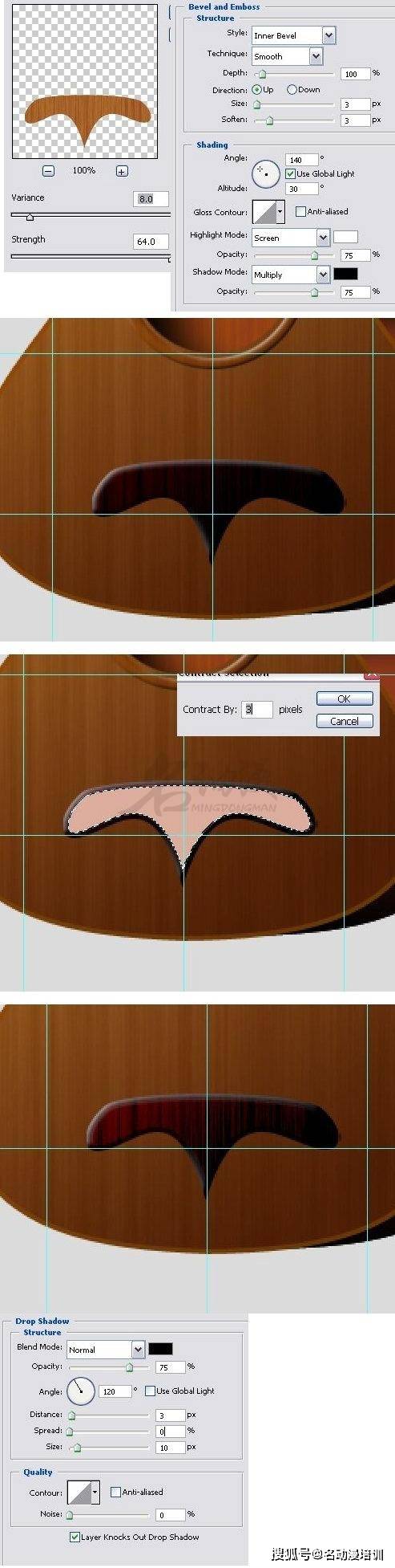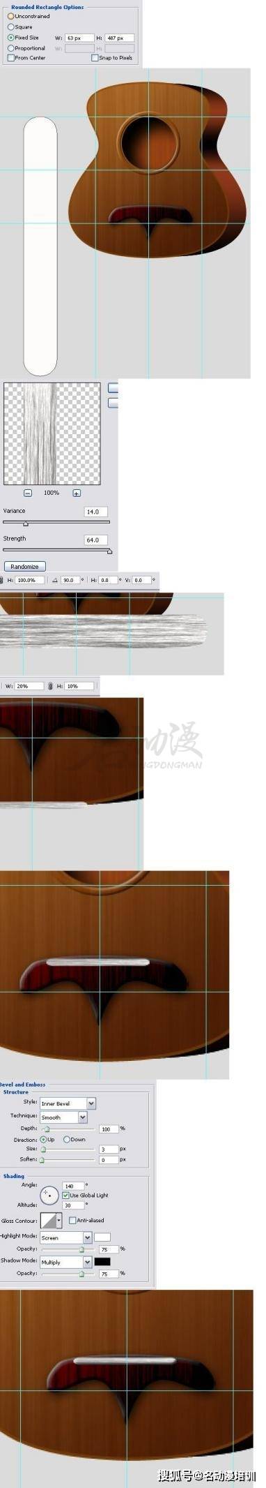 步驟八:然後將它移動到「音孔」下方對齊。接著將前景色更改為#90381a(範例)的顏色,背景更改為#ac6c2c(範例)的顏色,然後打開「濾鏡」點擊「渲染」選擇「纖維」,並應用方差設為:8和強度為:64的纖維數值。再將圖層混合模式設置為:顏色加深,然後應用斜面和浮雕。最後復制圖層並將其命名為「橋1」。