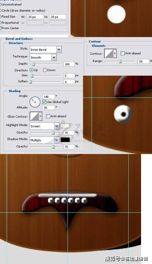 步驟十:新建圖層並將其命名為「弓母1(固定琴弦的)」,然後使用橢圓工具,打開幾何選項窗口,然後將寬度和高度更改為:20,在畫布上的任意位置,接著使用下面顯示的值來製作出斜面和浮雕和輪廓。然後將前景色設置為黑色。使用畫筆工具並將直徑設置為:5,在圓圈中間單擊一次,按著「Ctrl+ T 」在「弓母1」上,然後在水平和垂直比例輸入:50%,再將「弓母1」圖層復制五個,並將它們命名為「弓母2」、「弓母3」等,然後移動每個「弓母」圖層以對齊它們,如下所示。