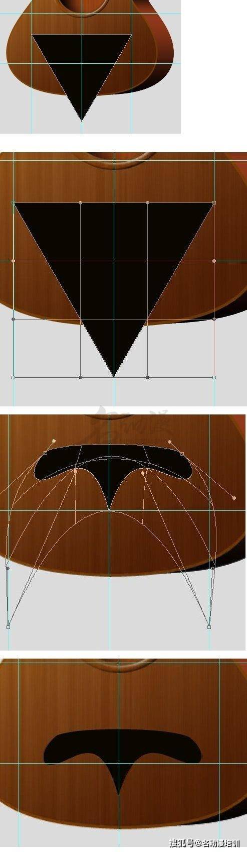 步驟七:接下來製作下弦枕部分,新建圖層將其名為「橋(下弦枕)」。使用多邊形工具,將邊的數量設為:3且顏色改為:黑色。如圖下所示建立一個等邊三角形,然後轉到「編輯」界面點擊「變換路徑」的「變形」,將原來的等邊三角形變換為如圖所示的形狀。