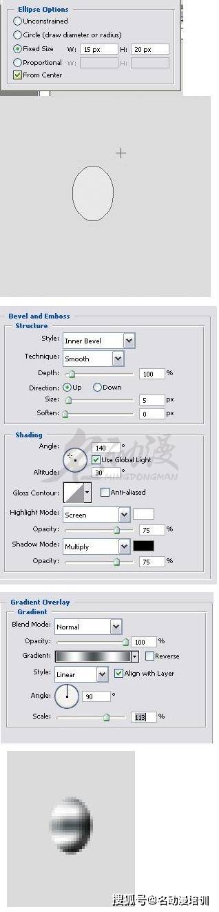 步驟十八:下面就是製作琴頭上的「弦軸」,新建圖層將其名為「弦軸1」,將前景色更改為#e9e8e8(範例)的顏色。然後使用橢圓工具繪制一個寬:15和高:20的橢圓,在使用顯示的設置應用斜面和浮雕和漸變疊加,從金屬預設中選擇了漸變類型:銀。