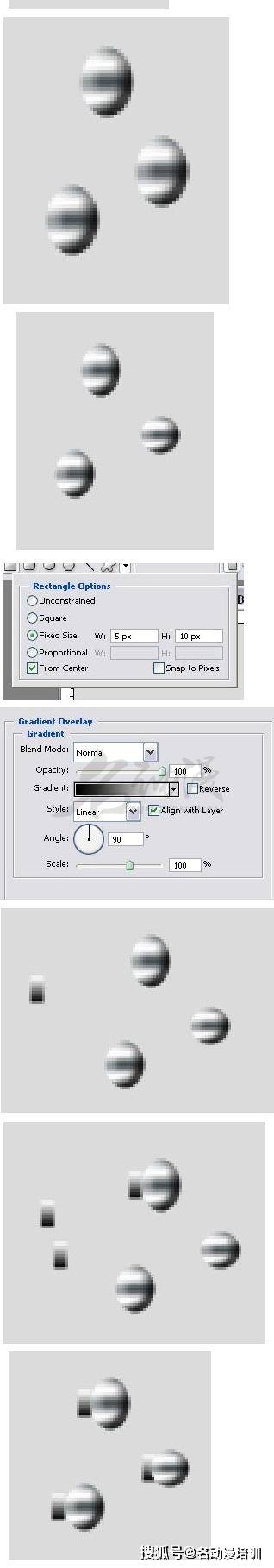 現在單擊「弦軸2」層。按住「 Ctrl+ T」將水平比例90度轉換圖像。將相同的內容應用於「弦軸3」圖層,水平比例為 70%。在掛鉤圖層下方新建圖層且將其命名為「釘擰1」。用矩形工具繪制一個寬:5和高:10的矩形,然後應用漸變疊加並柵格化圖層。將「釘擰1」圖層復制到「釘擰2」和「釘擰3」。如下圖所示對齊「弦軸1」和「釘擰1」。同樣對齊「釘擰2」和「弦軸2」以及「弦軸3」和「釘擰3」。