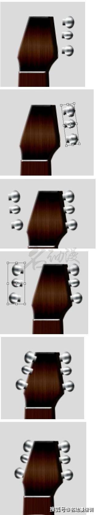 現在合並「弦軸1」和「釘擰1」圖層,以及「弦軸2」以及「弦軸3」和「釘擰3」圖層。如圖所示,移動銷釘使其與主軸箱對齊。現在按住「Shif」單擊每個釘層以選擇所有三個釘層。按「Crtl+T」如下所示應用變換,並確保匹配「琴頭」圖層的透視現在將它們與主軸箱對齊,如下所示。
