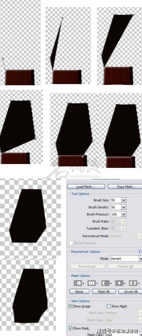 步驟十六:吉他的身體和脖子部分都畫好後,接著來畫頭部。在「琴脖」圖層下方創建一個新圖層且將其命名為「琴頭」,並將前景色更改為黑色。接著使用鋼筆工具選擇鋼筆工具並繪制如下所示的形狀。然後柵格化圖層,打開「濾鏡」點擊「液化」,接著液化圖像,如下所示。單擊確定並返回主窗口。