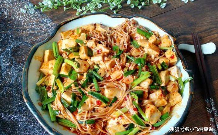 7、下入金針菇翻炒均勻(豆腐比較嫩,小心翻動不要弄碎了)。