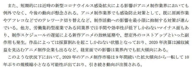 「動畫業界也不可倖免受到肺炎疫情影響,許多製作公司為了預防傳染,逐步將原畫與錄音改為遠距工作,希望將影響降到最小。但是這種勞動密集的產業仍然難以避免降低生產效率,工程延期或播映延期都會帶來額外的成本。有作品就因為疫情而賠錢,也有動畫工作室的2020年財報出現虧損,肺炎疫情帶來的影響可能會持續擴大,讓明年的市場規模出現10年來首度萎縮。」