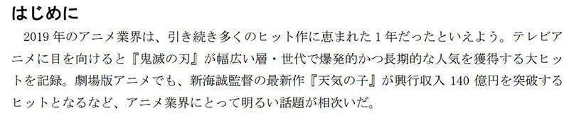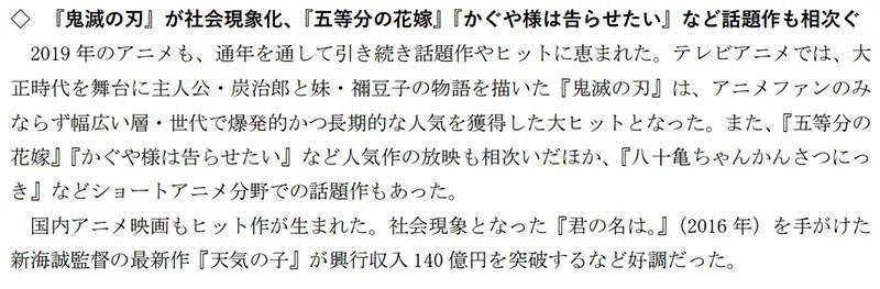 「2019年的動畫業界同樣出現很多熱門作品,包括電視動畫《鬼滅之刃》受到各年齡層廣大歡迎。新海城導演的動畫電影《天氣之子》也創下140億日圓的票房……」