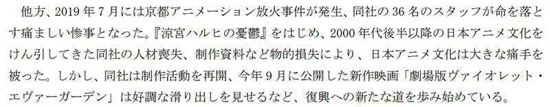 「2019年7月,京都動畫公司發生縱火事件,造成36名員工身亡。曾創造出《涼宮春日的憂郁》等引領2000年代後半動畫文化的人才、製作資料都因而喪失,令日本動畫文化承受重大打擊。不過該公司已經重新開始製作工程,今年9月公開《紫羅蘭永恆花園電影版》票房也呈現佳績,逐漸踏上重建之路。」