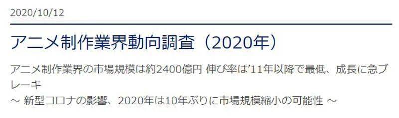 「2020年動畫製作業界動向調查:市場規模約2400億日圓,成長率自2011年來最低,急踩剎車。受到新冠肺炎疫情影響,2020年度可能出現10年來首度萎縮。」