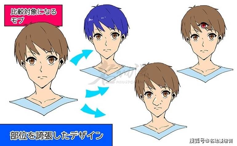 比如下面針對這個男主的幾種夸張化的設計,就分別是上述三種方法。