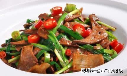5.鍋內留底油,先下青椒段、小米辣和蒜苗段白色的部分煸炒1分鍾;倒入炒好的豬肝,大火快炒幾下;關火!撒入蒜苗葉,利用余溫將蒜苗葉燙至斷生即可,一點味精,裝盤