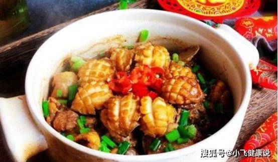 4、關火後,把醃制好的雞塊放在洋蔥、蔥姜蒜上,蓋上鍋蓋大火煮3分鍾,接著把小鮑魚放在雞塊上,蓋上鍋蓋中小火燜20分鍾。