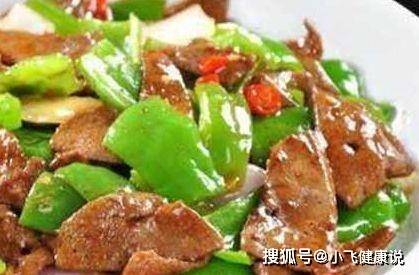 4.利用鍋中剩下的底油,下入姜蒜片,煸出香味,再下入杭椒和小米辣丁,翻炒均勻,感覺配菜均勻裹上油色時,下入豬肝,繼續翻炒1-2分鍾。