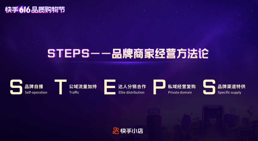 細心的讀者可能發現,「STEPS」是個復數,在快手電商舉辦616品質購物節線上發布會上,快手電商營銷中心負責人張一鵬也對此做出解釋。他表示,採用復數的原因在於快手月復購率達到65%,這意味著它是快手是可以長期經營的、有復購率的陣地,此外,復數也寓意在快手電商的生意是長期的生意,不知道怎麼布局快手電商的品牌,可以能夠結合這個方法論,來進行積極嘗試。