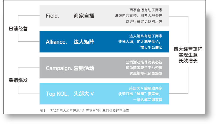 所謂「FACT」,是代表品牌商家在布局抖音電商時,需要經營好的四個陣地,分別為Field商家自播、Alliance達人矩陣、Campain營銷活動,以及TOP KOL頭部達人。據卡思了解,這個經營方法論是抖音在走訪50多個國際國內知名品牌,並分析他們的成功經驗後得出的系統性方法論,不同的品牌,可結合自己的生意目標、用戶目標、營銷預算、商品屬性,以及對抖音電商的入局深度等,來靈活配置四大陣地的運營資源和營銷投入,以實現GMV總量的穩定、可持續增長。