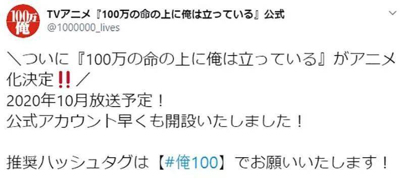 「《我立於百萬生命之上》終於決定動畫化了!預計於2020年10月播出!」