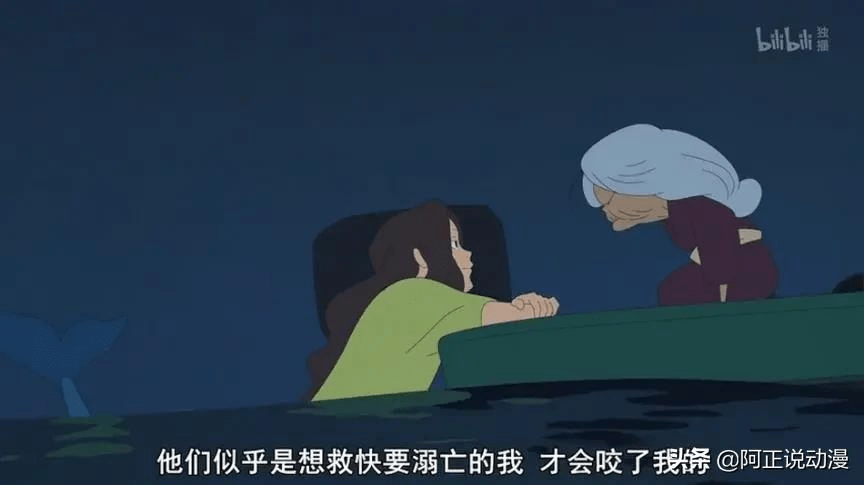 為了讓老奶奶不再孤單,戀人在她脖子上咬了一口,將老奶奶也變成了人魚,在今後的日子裡兩人一起潛游水下。