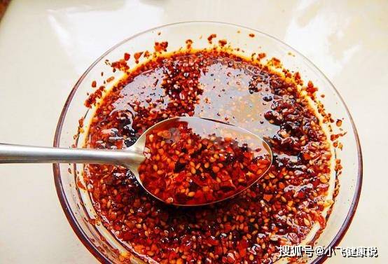 3.煸炒至油溫升高,香料變色,油鍋冒煙,就可以把所有香料撈出了。這時把炸香的油澆到辣椒麵上,這時你會聽到滋滋的響聲,邊攪拌邊淋油。