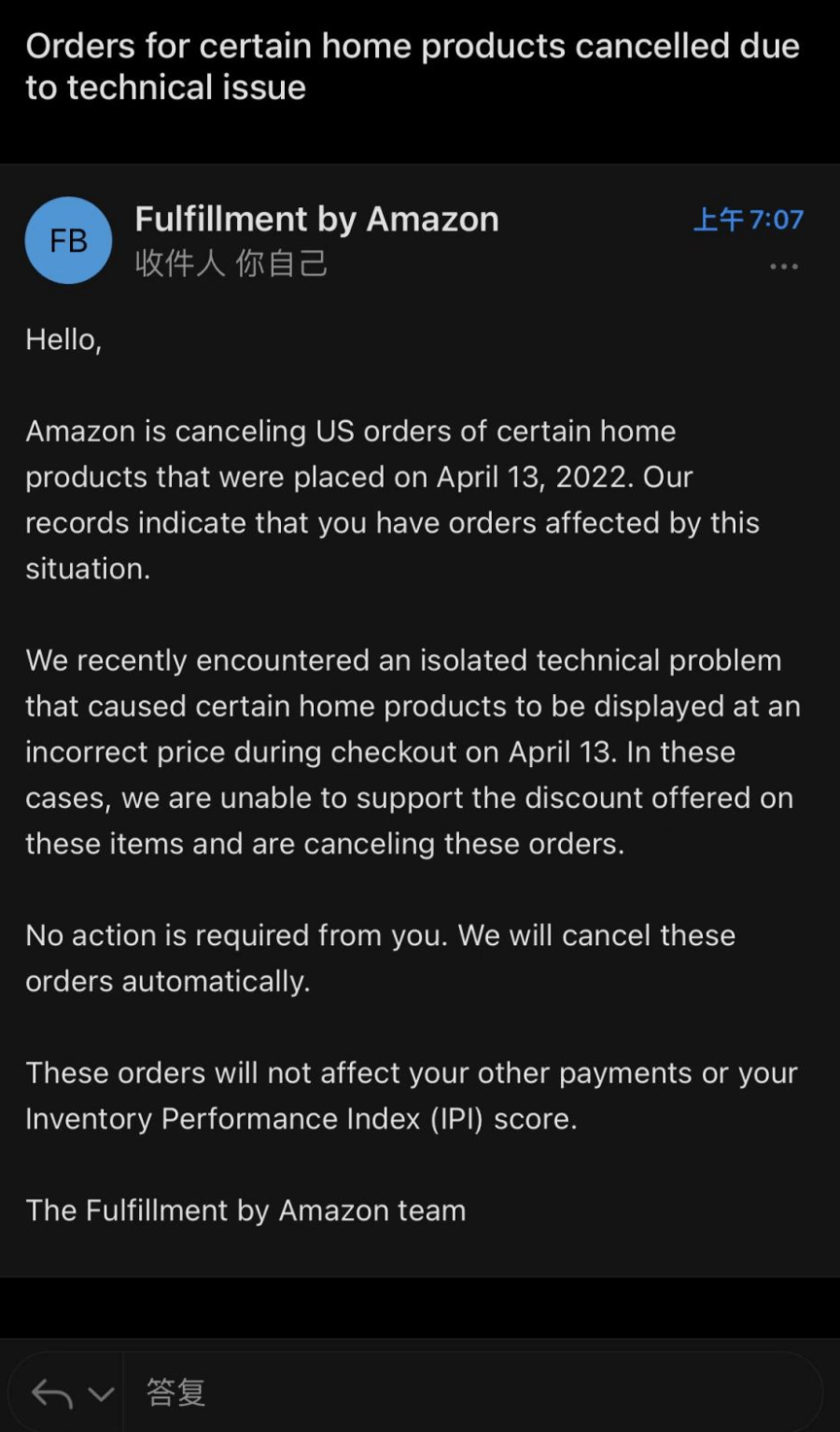 當然是全速攔截取消。相關賣家已收到亞馬遜通知,亞馬遜承認技術問題導致家居產品結帳時價格顯示不正確,已在自動取消這些訂單,並表示不會影響其他付款和庫存績效。