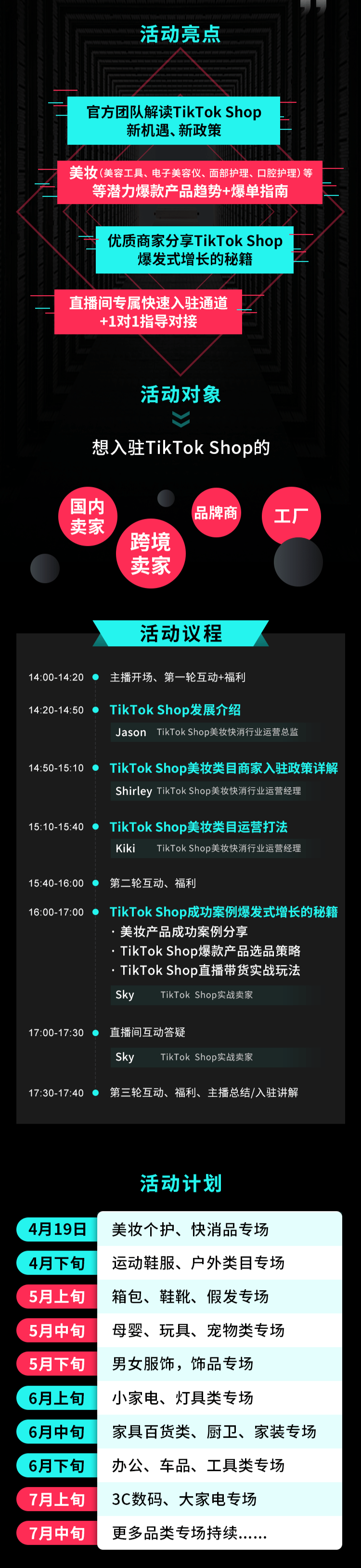 為了破除大家心中的門檻和芥蒂,小編這次又給大家帶來一個好消息!4月-7月鷹熊匯攜手TikTok Shop舉辦全品類(九大專場)線上招商會,這就來幫大家抓穩2022年流量機遇,搶占全球新商機!具體類目計劃可把目光移向長圖。