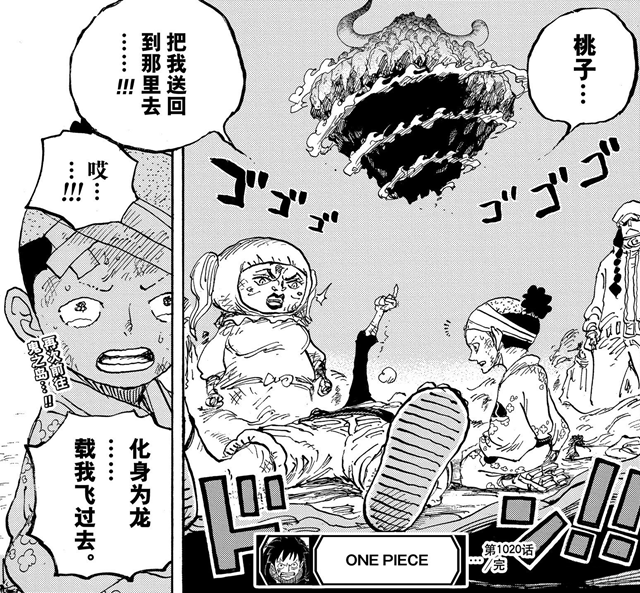 桃之助的意義就很明顯了,路飛已經直接點名了。路飛需要桃之助變身為龍,而他則騎著龍形桃之助,騰雲駕霧重回鬼之島。路飛之所以不用四檔飛回去,這是因為四檔是大招,有副作用,回到戰場就得廢一段時間。