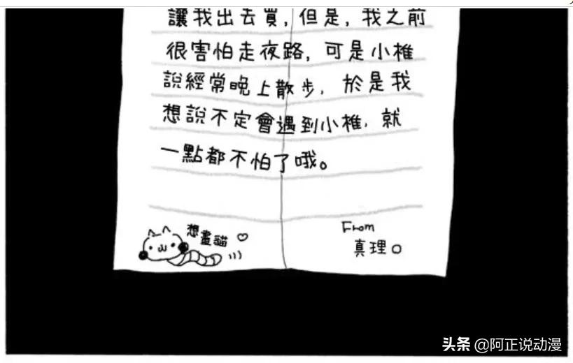 真理子非常感激小椎,並在給小椎的信上寫道,之前很害怕走夜路,可是聽小椎說經常晚上散步,一想到說不定可以遇到小椎,自己就一點都不怕了。
