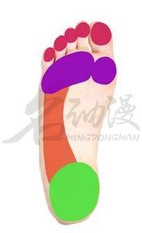 下圖中就是腳底板能和地面相接觸的區域,這里用紅色、紫色、橙色和綠色的色塊標注出來。大家可以看到其中腳趾和地面接觸的部分,一般都是集中在紅色區域裡的。