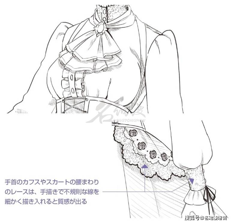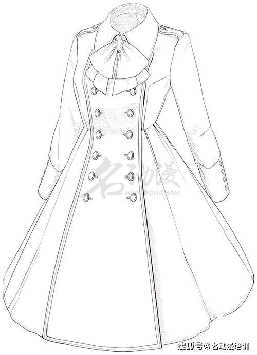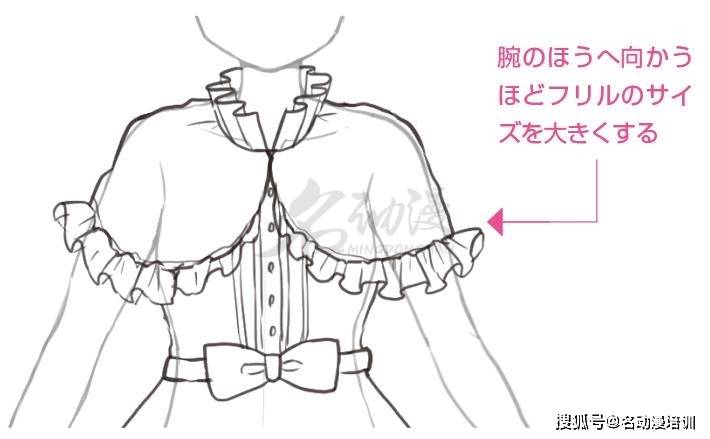 畫上領子、前襟、腰部的絲帶,此外裙子邊緣的褶皺現在可以不細致畫,用一圈圈的線概括出來。