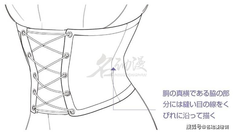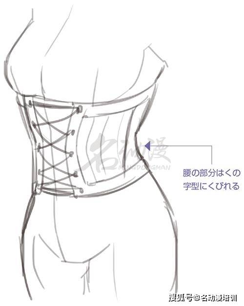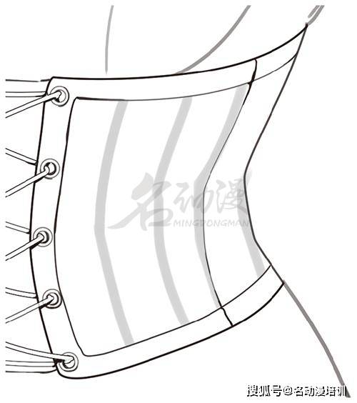 (1)和我們畫裙子一樣,先畫一個腰部和貼著腰部的胸衣草稿(注意要先畫出身體)。緊身胸衣覆蓋的位置,主要是在胸部正下方(甚至會比胸稍微高一些)的區域,稍微高於下腹部。