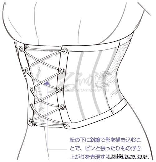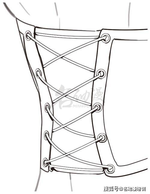 (3)細化緊身胸衣。注意兩邊繩索的交叉點是在軀干中心線的位置,將繩索擰緊。帶子交叉的位置可以畫出影子,表現出立體感。