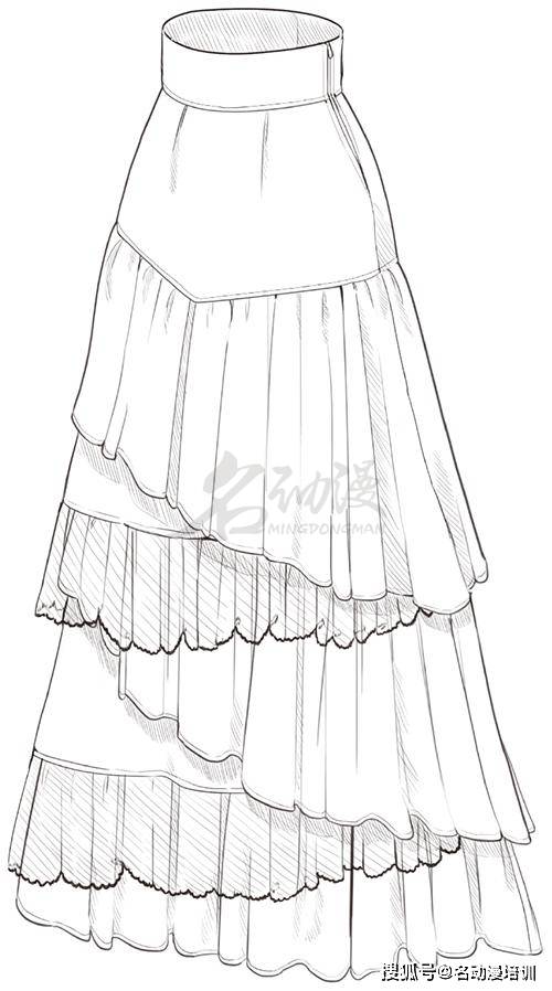 (3)不對稱裙子:左右褶邊不對稱的裙子,兩側的形狀和設計也與地面並不平行。