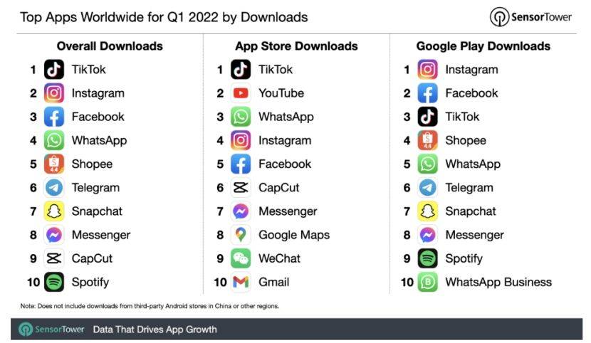 根據 Sensor Tower 的最新應用排名數據,在2022 年第一季度TikTok 再次成為下載次數最多的應用,擊敗了眾多 Meta 旗下包括Facebook和Instagram在內的多個應用。