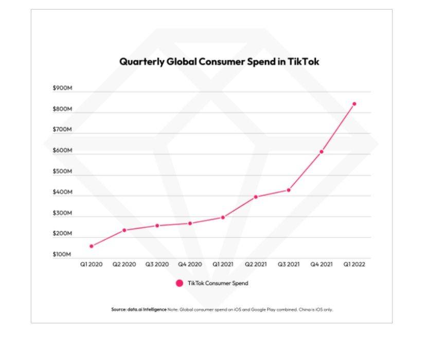 在 2022 年第一季度消費者支出計算中,TikTok在所有應用程式和游戲中均排名第一,成為第一個在特定季度的消費者支出中擊敗游戲的應用程式,這是繼2021年第四季度之後再次蟬聯第一。